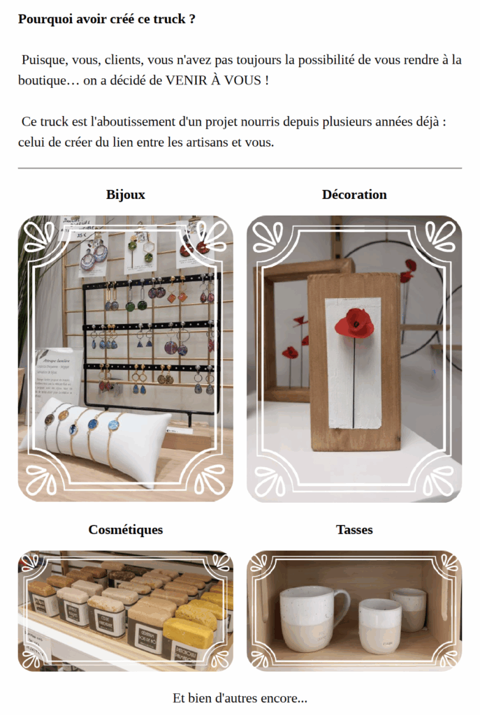 Comme le Créa’Truck est un concept original et singulier, il me semblait essentiel de raconter son « histoire » : ses origines, sa raison d’être, et les motivations de ma cliente. Cela permet à ses clients de mieux comprendre la démarche et les motivations de ma cliente.