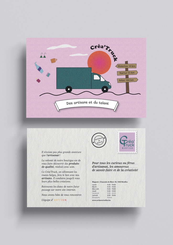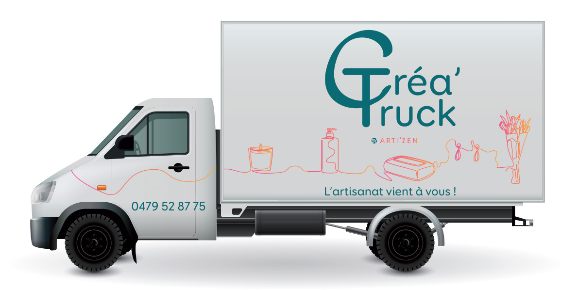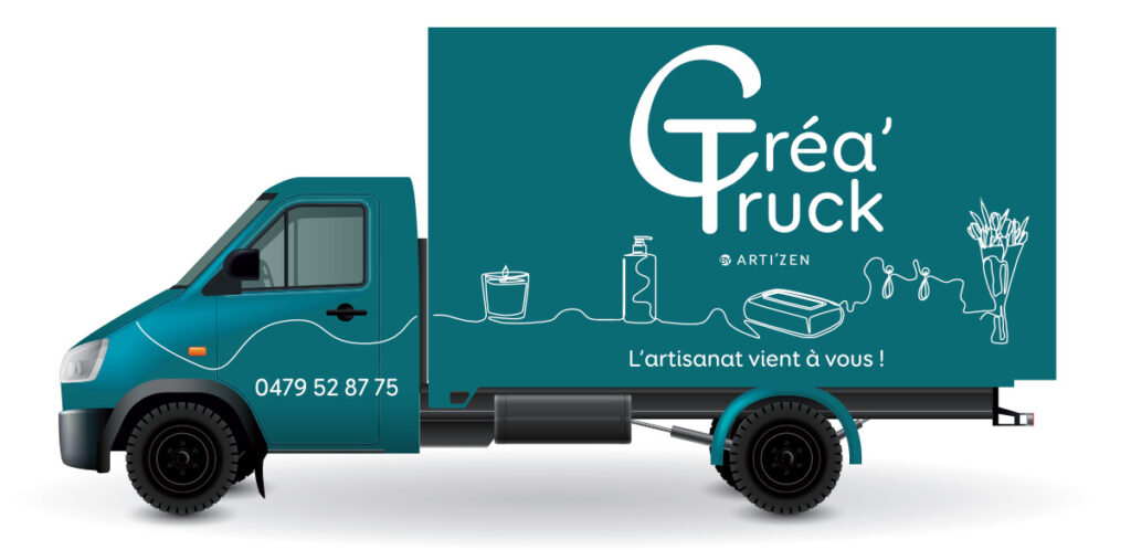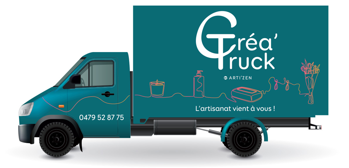 Dans le cadre de ma formation en communication à l’A Idées Formation de Nivelles, j’ai collaboré avec un vrai client, Arti’Zen à Nivelles. Cette boutique vend des créations d’artisans et a pour but de promouvoir l’artisanat au plus près des consommateurs. Dans le cadre de son futur projet « Créa’Truck », un petit van qui lui permettra de silloner la Belgique pour venir à la rencontre de ses client·e·s, j’ai réalisé :