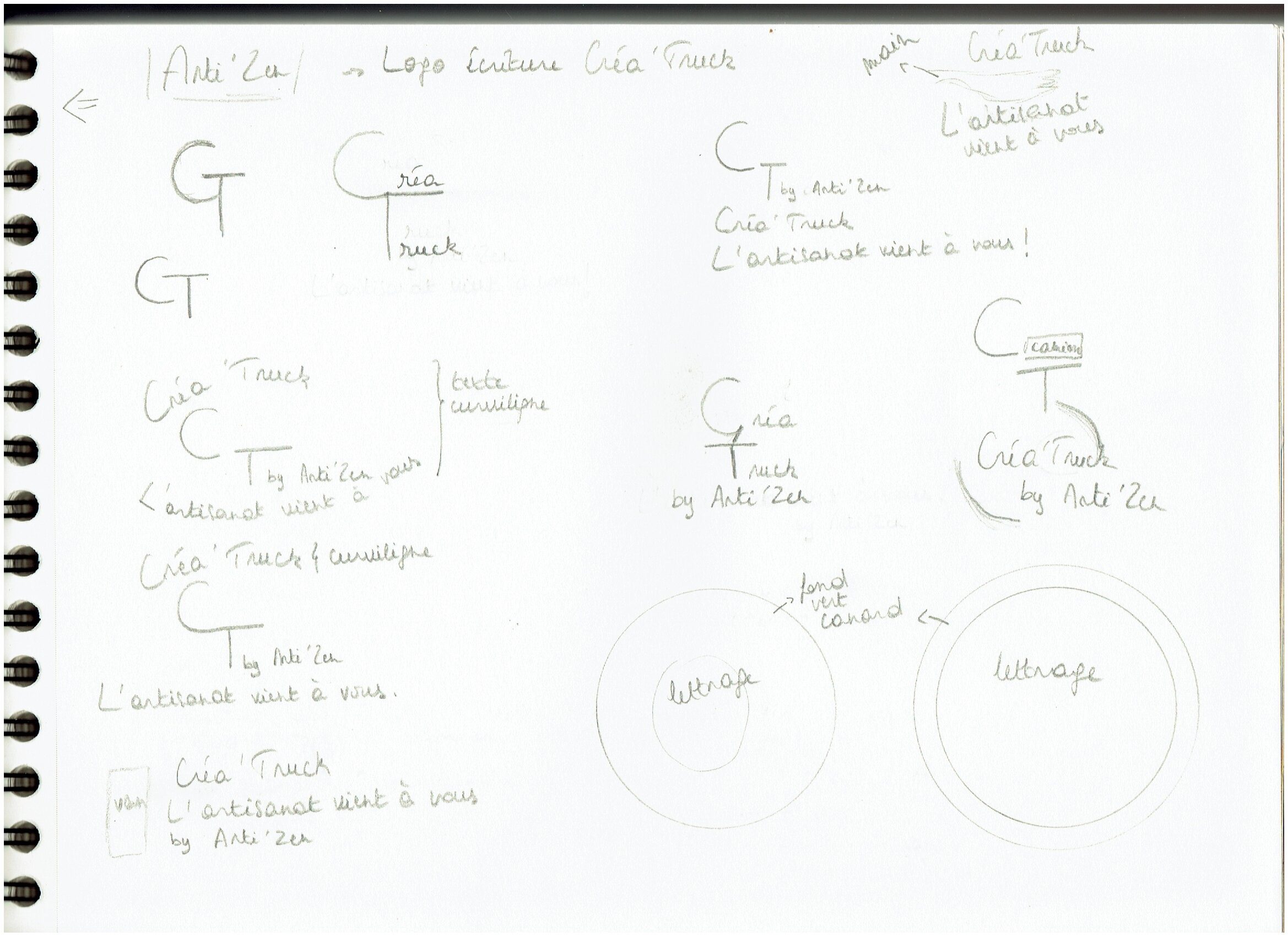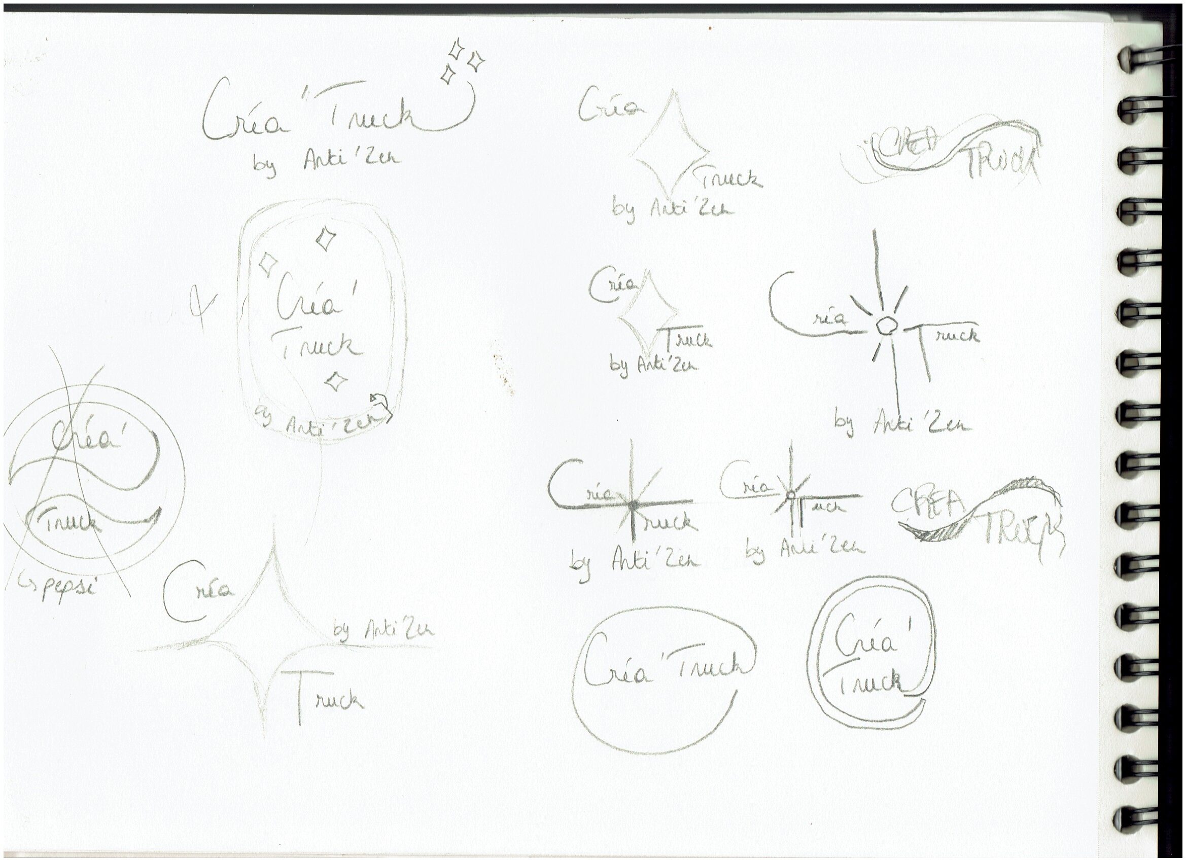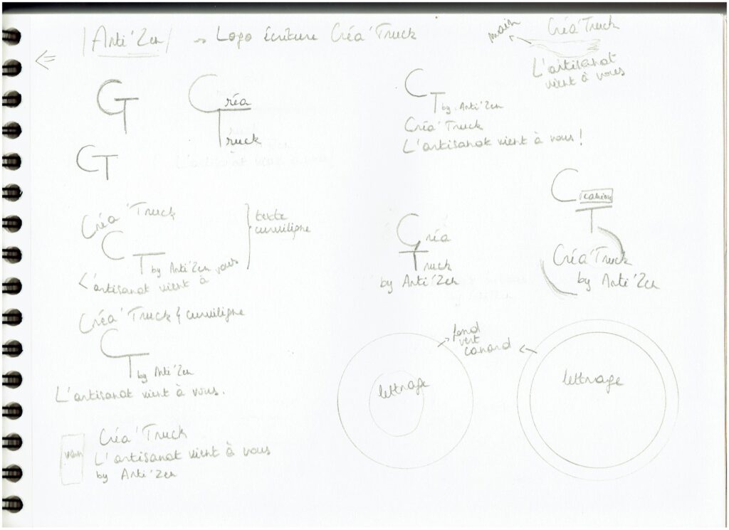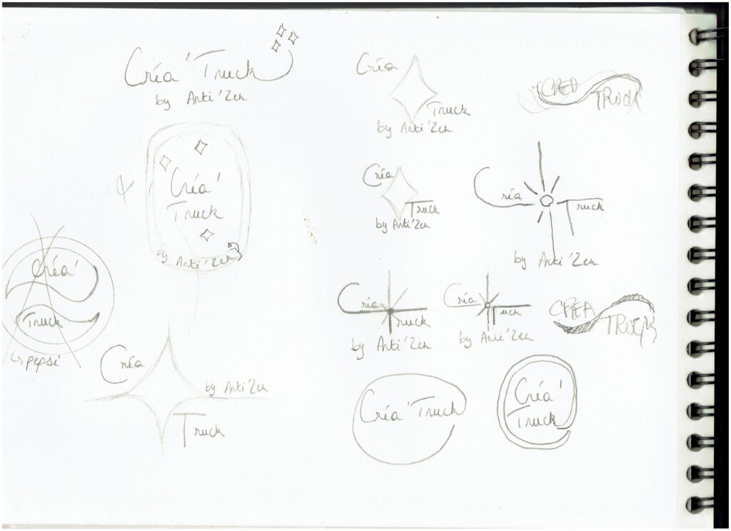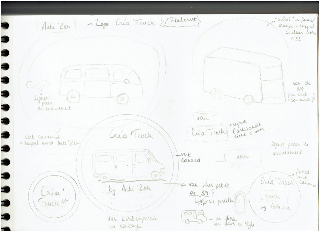 Cette page de croquis sont les premières idées que j’ai eues pour représenter le Créa’Truck.