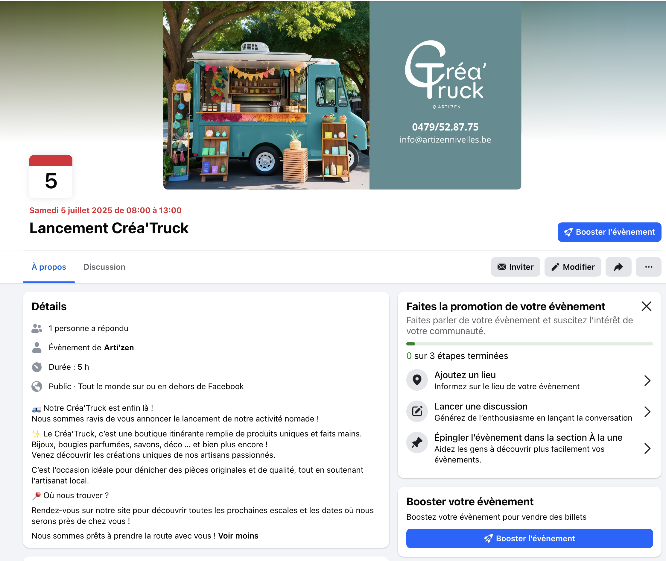 Graphisme et logiciel utilisé : vu que ma cliente n’avait pas encore acheté son camion, j’ai demandé à l’intelligence artificielle de Canva de me créer une image de truck. J’ai également indiqué sur la bannière de l’événement le logo, le numéro de téléphone ainsi que l’adresse mail. Ainsi, si les personnes ont une question en voyant la bannière et le nom de l’événement, elles peuvent directement prendre contact. J’ai ensuite publié l’événement sur Facebook via MetaBusiness Suite.